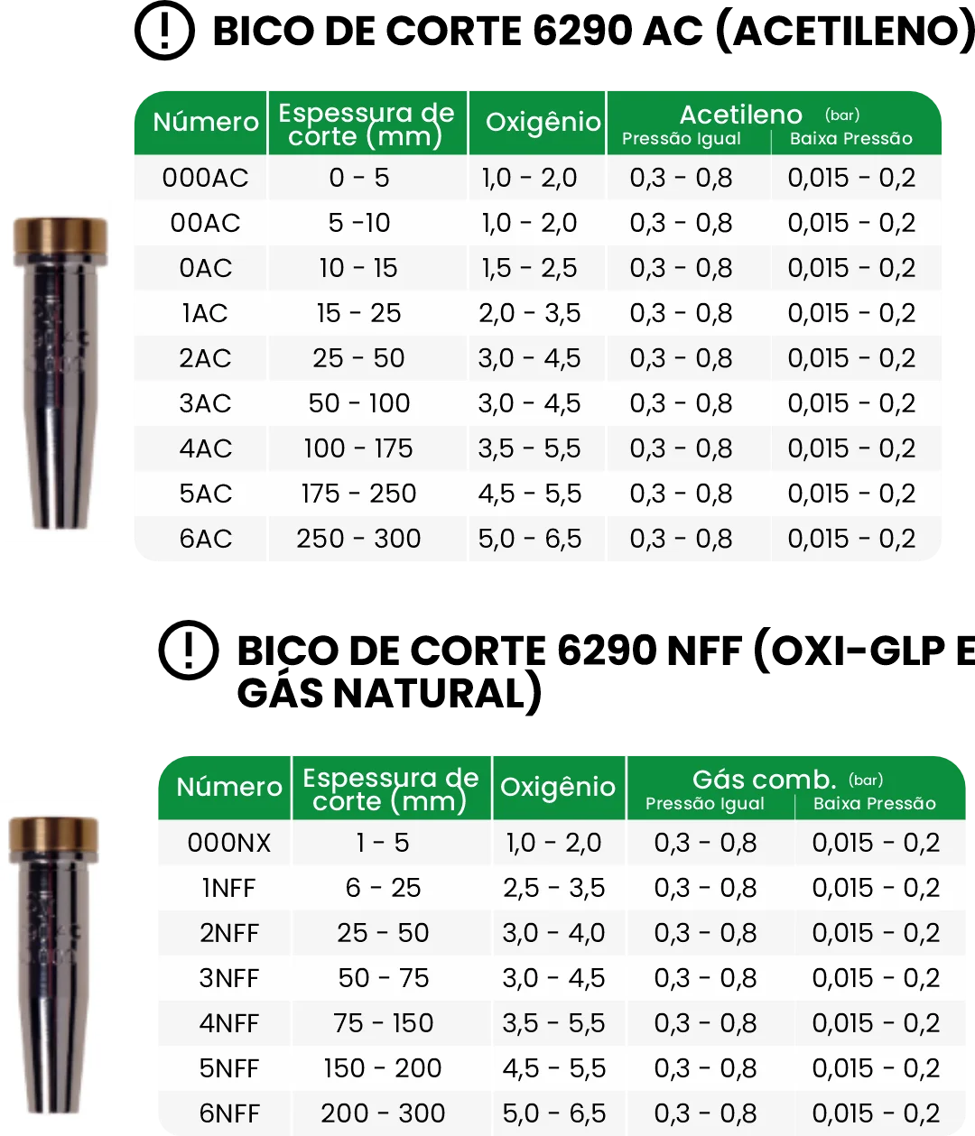 Características dos bicos de corte: