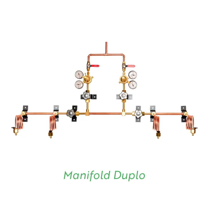 Central de manifold com válvulas de bloqueio com ramal duplo com 2 reguladores de alta vazão, para aplicações em que seja necessário um backup que não interrompa o fornecimento de gás em caso de manutenção do regulador.